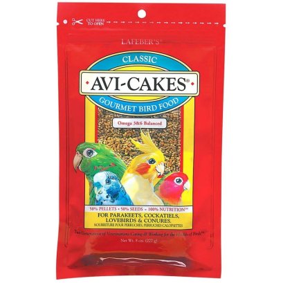 Avi-Cakes ผสมผสานเมล็ดพันธุ์พรีเมี่ยม 50 เปอร์เซ็นต์กับอาหารเม็ดที่สมดุลทางโภชนาการ 50 เปอร์เซ็นต์ที่ทำจากส่วนผสมที่ไม่ใช่จีเอ็มโอ ทั้งหมดนี้รวมเข้าด้วยกันกับกากน้ำตาลรสชาติเยี่ยม รูปทรงสี่เหลี่ยมเป็น“ กิจกรรมการเคี้ยวอาหาร” ที่สมบูรณ์แบบสำหรับนกแก้วของเรา