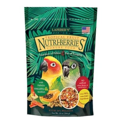 นกที่กระตือรือร้นและขี้สงสัยอย่างนกคอนัวร์ ควรได้รับอาหารที่เหมาะกับพฤติกรรมการผจญภัย อาหารเม็ดอาจให้สารอาหารที่เพียงพอ แต่ไม่มากพอที่จะดึงดูดรสชาติของมัน เมล็ดพืชทั่วไปทำให้นกพึงพอใจ แต่มีคุณค่าทางโภชนาการเพียงเล็กน้อย โชคดีที่มี ทรอพพิคอล ฟรุต นิวทริ-เบอร์รี่ ที่ได้ทั้งรสชาติและคุณค่าทางโภชนาการที่ดี นกของคุณจะต้องชอบกัดเจ้าชิ้นอาหารรูปเบอร์รี่ ที่มีทั้งเมล็ด ธัญพืชที่มีประโยชน์ ส่วนผสมเนื้อผลไม้สับปะรดมะละกอ มะม่วงที่บรรจุอยู่ในทรอพพิคอล ฟรุต นิวทริ-เบอร์รี่ และ 33% เป็นแบบเม็ด มีขนาดเหมาะสำหรับ นกคอนัวร์ นก ไคท์ เซเนกัล เมเยอร์ หรือนกตัวเล็กอื่น ๆ ที่จะใช้เท้าของเขาจับอาหารได้
